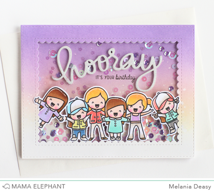 I stamp, coloring the images using copic then die cut it. To coloring the background, I'm using Dye Ink with blending tool then I splash some water with my brush. I die cut the coloring background with Framed Tags Park Avenue dies and make it as shaker card. I glue the girls image on the top of the shaker card.